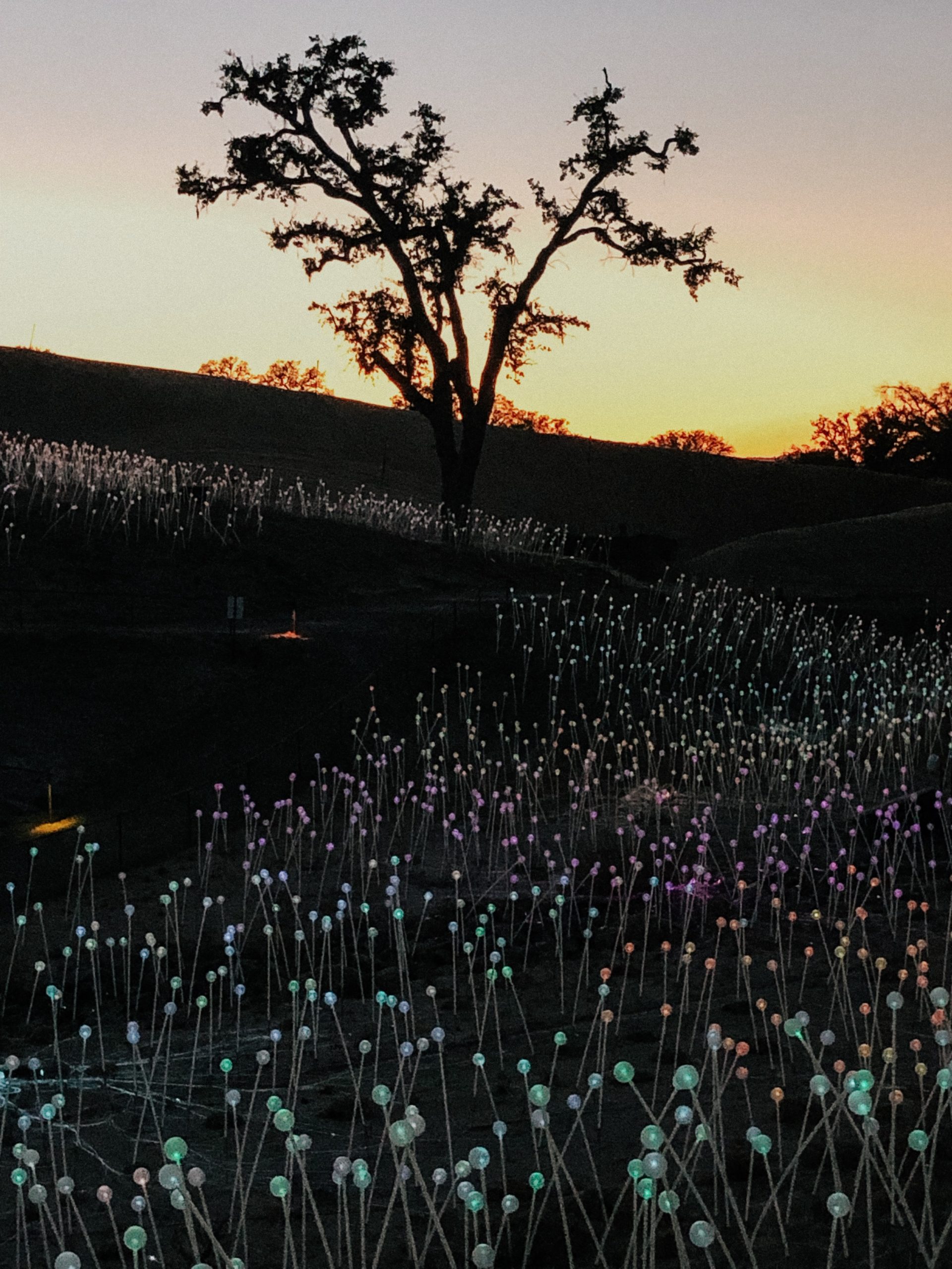 Later, feeling good about our accomplishments, we cleaned up and headed into Paso Robles with tickets to see the latest attraction, Field of Light at Sensorio. Created by British artist Bruce Munro, who is known for immersive large scale light based installations, this 15 acre walk-through artwork covers the gently rolling Paso Robles hillsides with over 58,000 stemmed spheres. We had bought and reserved tickets for the first “showing” of the evening, and gathered in line close to the entrance waiting for the gates to open, promptly st 5:00pm. Powered by solar each sphere begins its illumination with a gentle opaque white glow. Never having see photos or media of the attraction, Husband had a big question mark hanging over his head, like WTF? But we continued to stroll slowly along the trail, eventually arriving at what was probably the farthest end point of the exhibit. Here we posted up on a long bench to sit as dusk rolled in and the magic began.